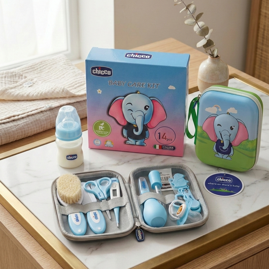 طقم العناية المتكامل للأطفال من شيكو 14 قطعة بجراب 3D وببرونة 60 مل. يشمل مقص وقصافة وترمومتر وأدوات طبية آمنة خالية من BPA للعناية اليومية بنظافة المولود.